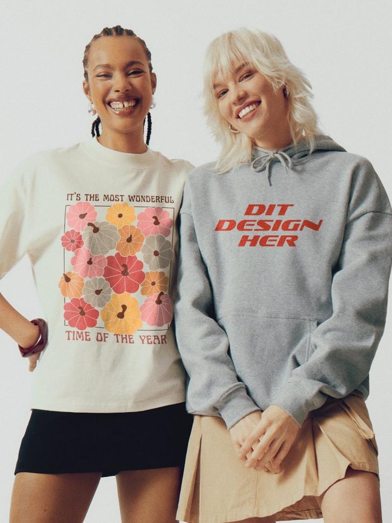 Skab dit eget design, og vælg mellem over 250 forskellige produkter, som vi kan trykke eller brodere dit design på efter ønske.